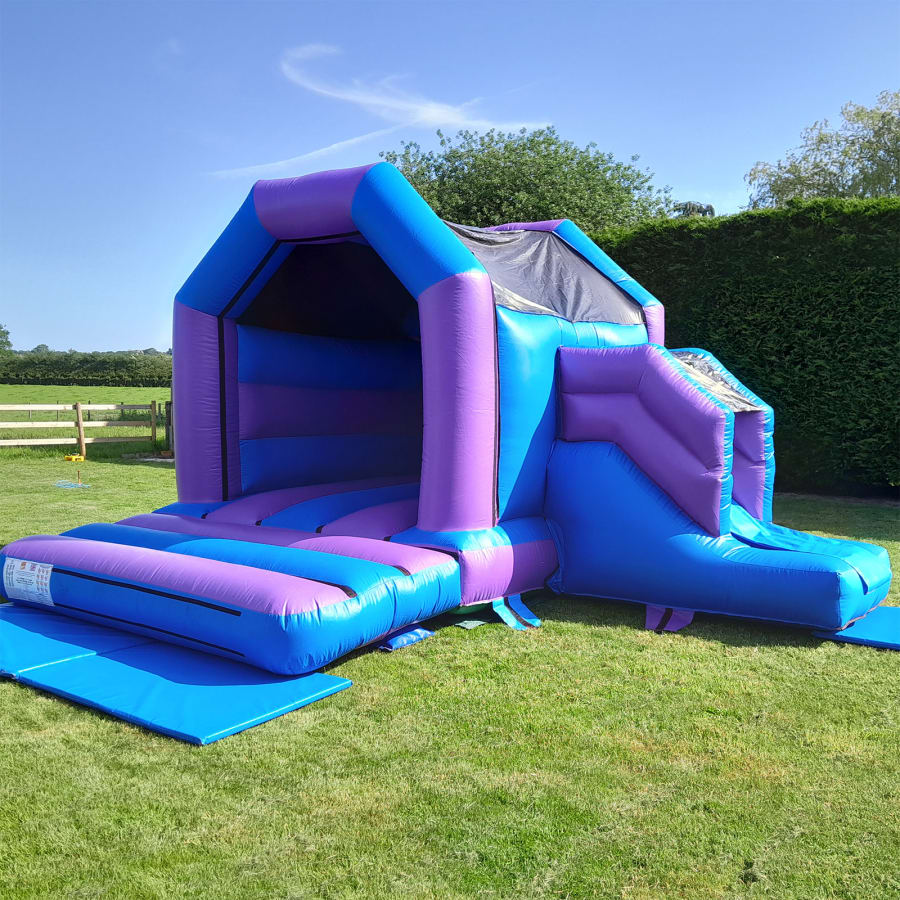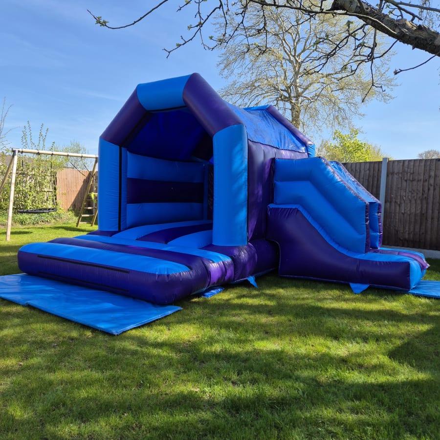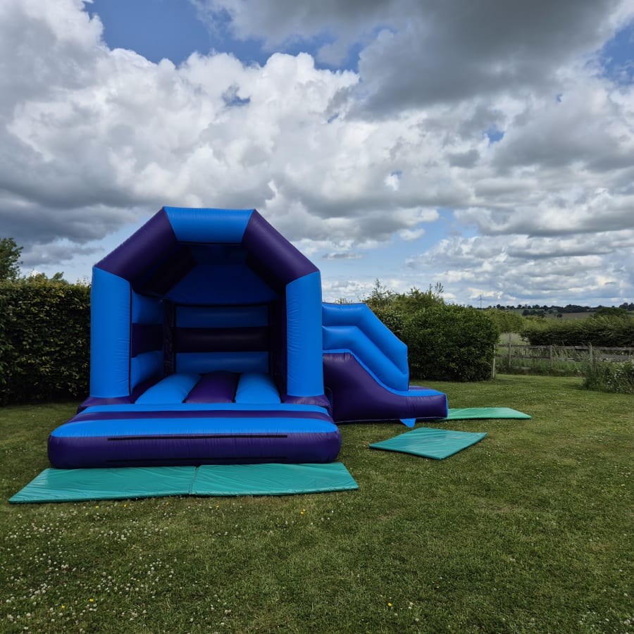 Bring double the fun to your event with our Jump and Slide inflatable, featuring a vibrant purple and blue colour scheme! This 15ft x 17ft bouncy castle combines the thrill of bouncing with the excitement of a built-in slide, offering endless entertainment for kids of all ages. The spacious jumping area allows for plenty of active play, while the slide adds an extra element of adventure, making it perfect for birthdays, family gatherings, or any celebration.